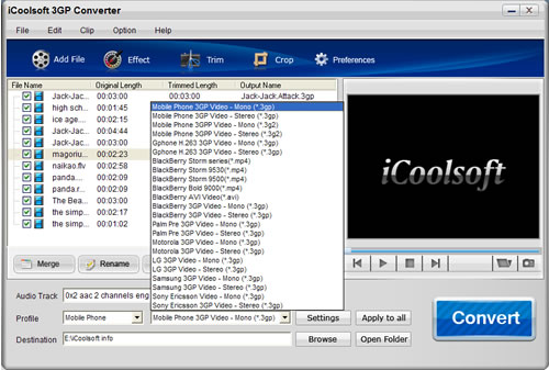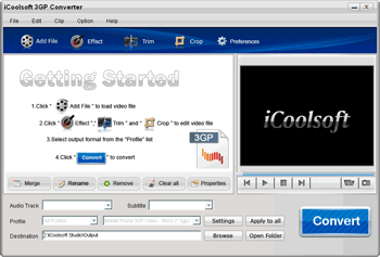 This iCoolsoft 3GP Converter allows you to preview video and take snapshot, merge selected files, convert videos to different formats at the same time, apply effect adjustment to all videos by one click, choose Audio Track, Subtitle and more features.