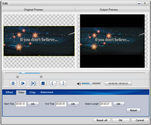 You can specify any video segment to convert, merge several files into one, crop video playing area, adjust video effect and add text/image watermark to video with this 3GP Converter. Thus you can create personalized videos for watching on mobile phones.