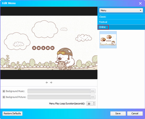 As the best Blu-ray Burner software, it enables you to choose Blu-ray menu templates. What's more, it offers you various Blu-ray menus and allows you to download and apply online Blu-ray menu templates.