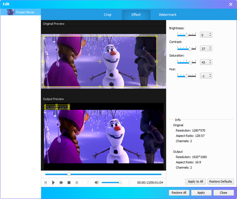 For the video, you can customize the video effects including brightness, contrast, saturation and hue. You can crop or watermark the video as well.