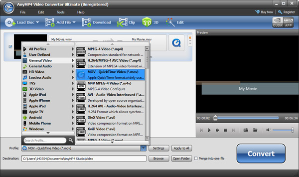 Choose your needed output format(s) from the profile list. There you can choose to convert WLMP WMV/MP4 format to videos like MP4, AVI, MOV, FLV, MPG, TS, MKV, M4V, VOB, 3GP, WebM, MTV, DV, DPG AMV, H.264/MPEG4 and audio types like MP3, AAC, M4A, WMA, OGG, ALAC, WAV, and FLAC. Also you can output WLMP to videos optimized for specific devices like iPhone 6, iPad Air, iPod touch, PSP, Samsung, HTC, Nokia, and Surface Pro as well as HD videos if the source Windows Movie Maker video was made with HD resolution.