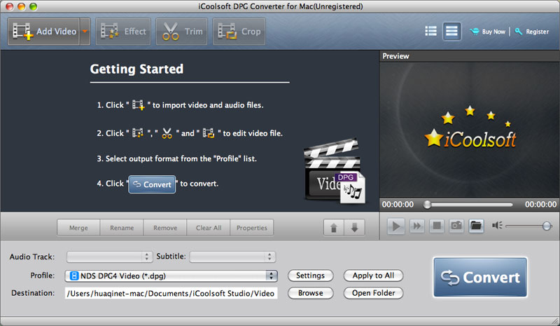 Do you want to convert video/audio files to DPG/DPG2/DPG3/DPG4 video and MP2/MP3 audio that can playback on DS or DS Lite with the Moonshell installed? OK. The DPG Converter for Mac is the best solution for you. The software is an exclusively designed software for converting to DPG. It can provide you a satisfactory result. In detail, it can convert MPG, MPEG, MPEG 2, VOB, DAT, MP4, M4V, TS, RM, RMVB, WMV, ASF, MKV, AVI, 3GP, 3G2, FLV, SWF, MPV, MOD, TOD, HD video, etc and all the audio formats to the formats supported by DS.