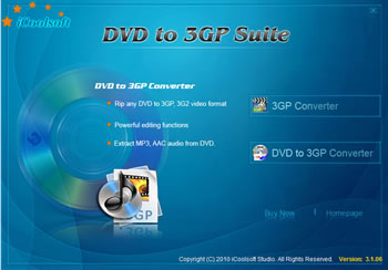 iCoolsoft DVD to 3GP Suite is a multifunctional tool which can help you to enjoy any video you like in your mobile phones. Containing 3GP Converter and DVD to 3GP Converter, this excellent DVD to 3GP Suite enables you to convert any kind of video or DVD to 3GP format. Owing to its professional functions, you can be fully ensured with the quality of the output files and the conversion speed.