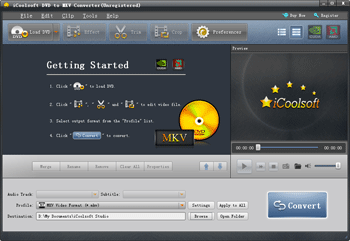 iCoolsoft DVD to MKV Converter is the best tool to help you rip DVD movies and store on computer. This DVD to MKV Converter can convert DVD to MKV, H.264, HD AVI, HD WMV, HD MOV, HD MPEG, and other HD videos and general videos.