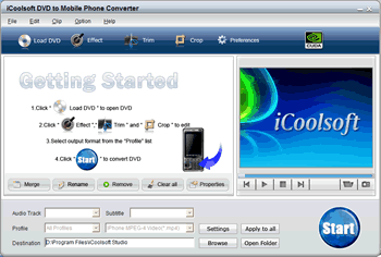 Professional as it is, iCoolsoft DVD to Mobile Phone Converter can help you to convert DVD, DVD Folder, and DVD IFO files to MP4, WMV, 3GP, AVI, or 3G2 format with high output quality and fast conversion speed. So with this great software, you can enjoy any DVD with any kind Mobile Phone, including, iPhone, Gphone, Sony XPERIA, BlackBerry, Palm Pre, Motorola, LG, Samsung, and Sony Ericsson.