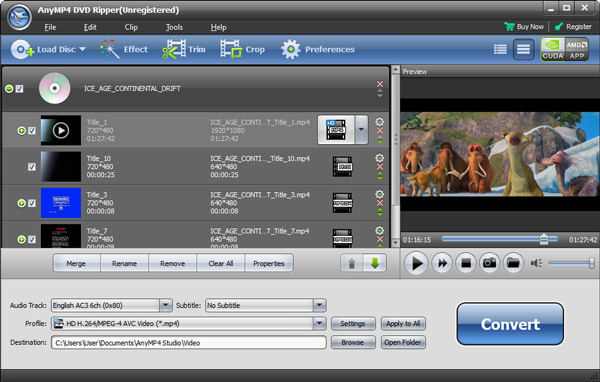 As the Best DVD to MP4 Converter, you are able to load DVD disc, convert DVD and rip DVD to MP4, H.264/MPEG-4 AVC, MOV, AVI, HD MP4 and even HD video files like HD H.264, HD MOV, HD AVI or convert DVD to MP3, AAC, WMA, M4A, AC3, AIFF, AMR, AU, FLAC, MP2, OGG audio files.