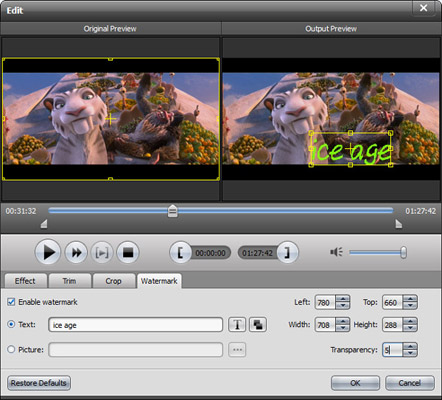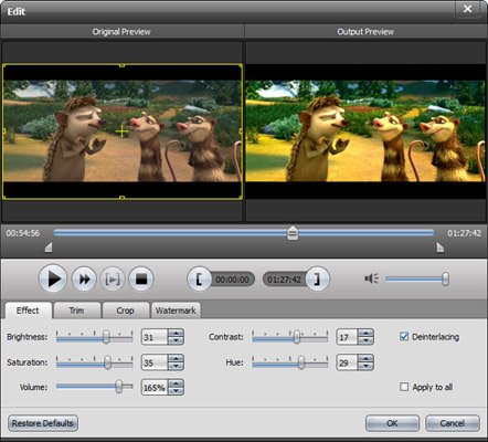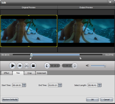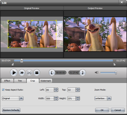 In addition, this DVD to MP4 Converter provides you with most powerful editing functions, you can trim movie to get designated part, merge multiple videos into one file, crop the playing region to cut black bars or retain any part as you want, adjust video effect, add text or image watermark to video, and so on.