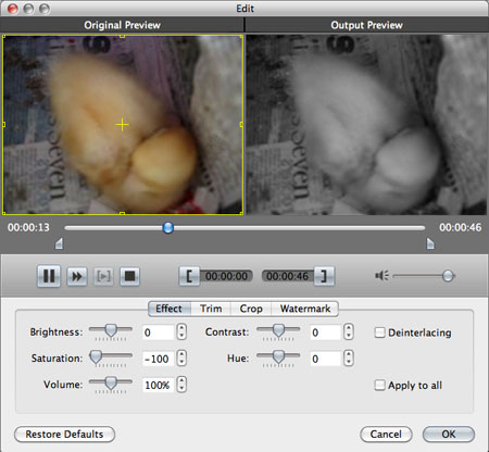 This Mac Flash converter enables you to remove black edges around your movie by setting the crop values. The output video Zoom Mode can be selected from Keep Original, Full Screen, 16:9 and 4:3. - Set video effect