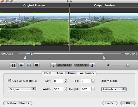 The "Crop" function lets you to select the Aspect Ratio for the target file. With that function, you can also crop the video image of the original file to zoom in some certain part or get rid of the black borders.