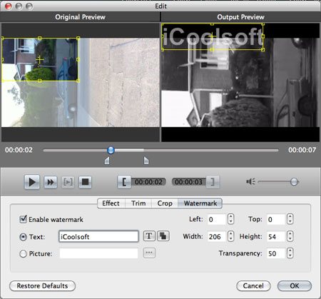 iCoolsoft iPhone Converter for Mac also helps you edit videos by splitting, merging, cropping, adjusting effect, adding watermark, etc. You can easily create personalized Flash videos for posting on internet.