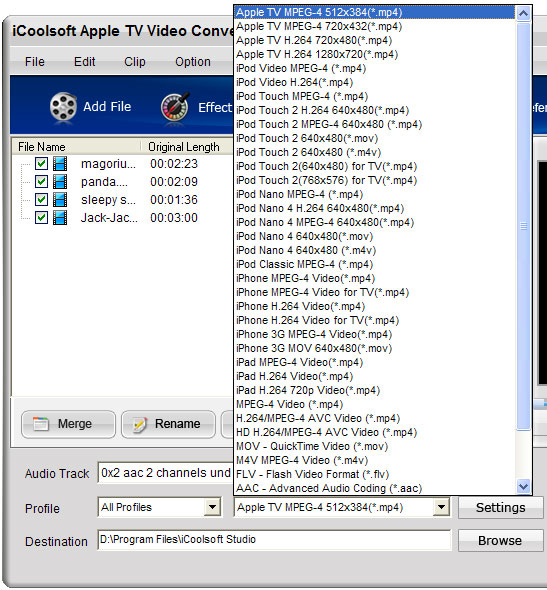 iCoolsoft Apple TV Video Converter is qualified to help you finish that converting job. It is a professional software which is specially designed to convert video files for Apple TV. You can use it to convert many video files to Apple TV format with high output quality and fast conversion speed.