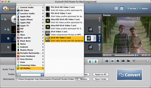 Step 4: Choose the output format as "DivX" from "Profile" right drop-down list and set your output folder. Click "Convert" to convert DVD to DivX Mac.