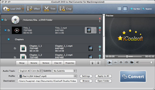 Convert DVD to iPad on Mac is your problem? Here recommend you a solution if you are smookered, you can try iCoolsoft DVD to iPad Converter for Mac. It is a powerful Mac DVD to iPad converter which can convert all DVD formats to videos that suit for iPad or iPad2 which support MP4, H.264, MOV, M4V, MP3, AAC, M4A, etc. Rich profiles are provided by this iPod Converter for Mac for you to directly get video/audio files compatible with iPad ,iPad2, and other devices. This easy to use and versatility tool also enables you to edit your video before converting DVD to iPad for Mac. You can adjust brightness, saturation, contrast ,ect; trim your facourite part; crop the screen to get rid of black bar; add taxt or image watermark to make your video more suit your viewing habits. Remember batch operation can save you a lot of time when you convert DVD to iPad on Mac . This tool is suitable for all users , no matter you are a beginner or a pro user, it can meet all you need when you convert DVD to iPad on Mac. Beginners can use the ready profiles to easily get proper videos, and pro users are allowed to customize all video and audio encoding setting, such as Video Encoder, Resolution, Frame Rate, Video Bitrate, Audio Encoder, Sample Rate, Channels, Audio Bitrate, etc.