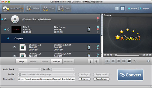 iCoolsoft DVD to iPod Converter for Mac is an outstanding DVD to iPod Converter on Mac to help Mac users to convert DVD to iPod on Mac , make your problem of 'How to convert DVD to iPod' becomes as easy as ABC. It can rip and convert DVD files to iPod formats like MP4, MPEG-4, H.264, MOV, M4V video and audio formats as MP3, M4A, AAC audio for iPod nano 6, iPod touch 4,iPhone4, iPad2, etc. Excellent decoding technology make you enjoy high quality video life. It also own various of video edit tools, you can make video of your own individual. Merge sereval clips into one file, crop your video displaying area, trim any length of your video, add text or picture watermark ,ect. It also allowed you to grab ScreenShots and extract music from your video files. You can download free full version DVD to iPod Converter for Mac on trial.