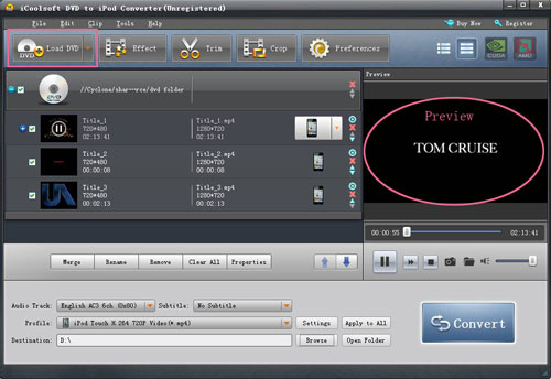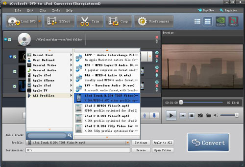 iPod is a line of portable media players created and marketed by Apple Inc. The product line-up currently consists of the hard drive-based iPod Classic, the touchscreen iPod Touch, the compact iPod Nano, and the ultra-compact iPod Shuffle. Over 297,000,000 units have been sold worldwide until December 2010. Using iPod player, we could easily and conveniently enjoy songs and video files. Here in this guide, we are going to discuss how to play back DVD moives through iPod. It seems impossible technically. However, nothing is impossible. It is actually a very easy job as long as we have the assistant from a professional DVD to iPod converter. iCoolsoft DVD to iPod Converter is a great choice because it possesses powerful deciphering ability and supports various audio and video output formats. In addition, it also could rip and convert DVD movies to many popular audio formats directly. The conversion speed is very fast and the output quality is quite high. Free download its trial version and have a try. You will find it very easy to use.