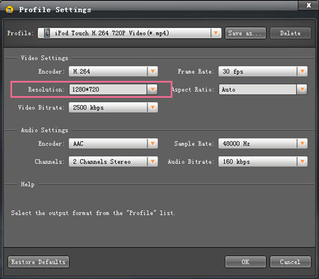5. Click "Settings" button and you can set the Resolution, Frame Rate, Video Bitrate, Sample Rate, Channels, and Audio Bitrate. As for the Resolution, you can even input your own one if you can not find a proper one from the given list.