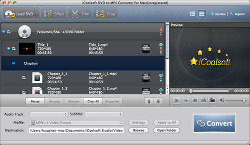 To rip and convert DVD movis to MP4 format has become an ineluctable job since we all want to enjoy the DVD movies we like through our portable media players anytime anyplace as we want. MP4 is a multimedia container format standard specified as a part of MPEG-4. It is most commonly used to store digital video and digital audio streams, especially those defined by MPEG, but can also be used to store other data such as subtitles and still images. Actually, it is very easy to rip DVD movies and convert DVD movies to MP4 format only if we have a great assistant - iCoolsoft DVD Converter for Mac.