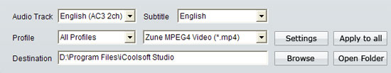 Step 3: Select Audio Track and Subtitle. Choose the output format from "Profile" drop-down list. Click "Apply to all" to set the format for all source videos. Click "Browse" button to set output folder. Use "Open Folder" to quickly open that folder.