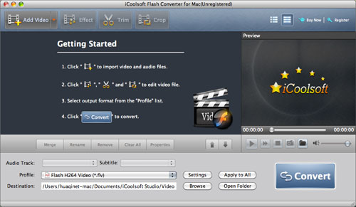 iCoolsoft Flash Converter for Mac is also a video editor which enables you edit videos by splitting, merging, cropping, adjusting effect, adding watermark, etc. You can easily create personalized Flash videos for posting on the web.