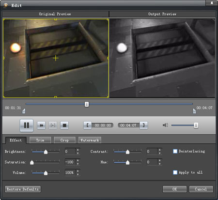 3. Button "Effect", "Trim", "Crop", and "Merge" can help you to adjust video effect, trim video clips, change Aspect Ratio, add text or picture watermark, and merge several files into one whole file.