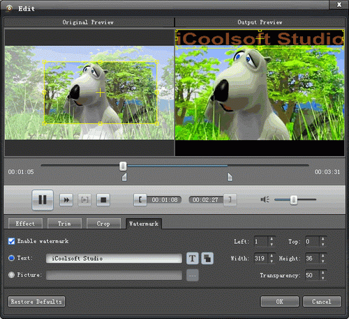 To add picture watermark, you have to check "Picture" and click "Folder" to find the picture in your local disc. Dragging or adjusting the values in the boxes can help you to locate the watermark at the place you prefer.