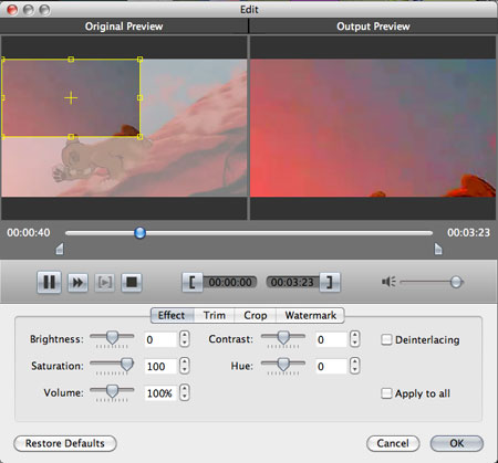 The "Crop" function allows you to select the Aspect Ratio, including 16:9, 4:3, and Full Screen. With that function, you can also crop the video image of the original file to zoom in some certain part or get rid of the black borders.