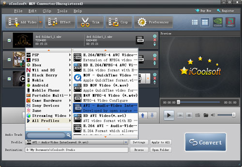 Step 2: Open "Profile" drop-down list and choose AVI as the output format.