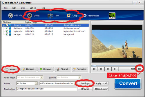 3. Button "Effect", "Trim", "Crop", and "Merge" can help you to adjust video effect, trim video clips, crop displaying area, add text or picture watermark, and merge several files into one whole file.