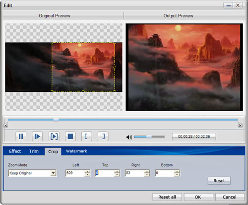 You can use the crop function to crop the display area. You can just drag the yellow frame or you can click the buttons. You can also select the 'Zoom Mode" from its drop-down list, which including Full Screen, Keep Original, 16:9, and 4:3.