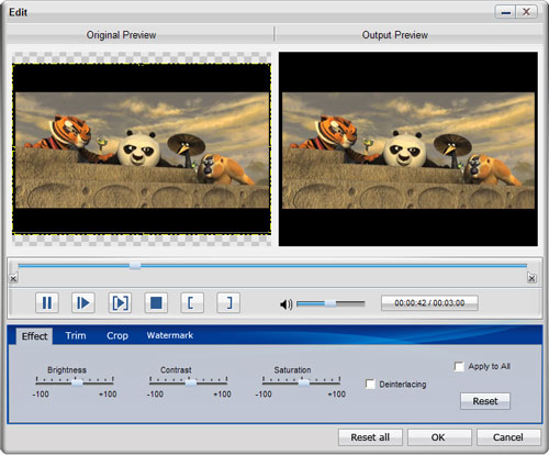 Drag the corresponding slider bar to adjust the Brightness, Contrast and Saturation. You can also check the "Deinterlacing" check box to improve video display quality of the interlaced video.
