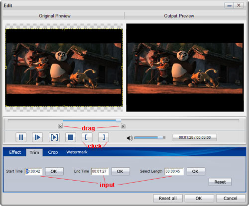 If you do not like some part of the original file, you can use the trim function to get rid of that part. There are three ways for you to select the clip. You can drag the scissors icon, or click the start time and end time button, or input exact values in the boxes.