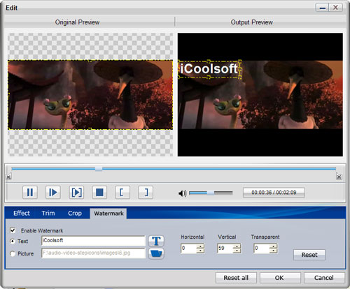 The software allows you to add both text and picture watermark according to your need. You can adjust the size, font, color, etc. for the text watermark. You can also easily adjust the location and transparency of the watermark.