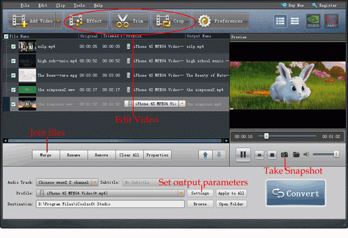 Step 3: Select a video and use "Effect, Trim, Crop" buttons on the tool bar to edit it as you like. If you want to join several files, select them from the file list and click the "Merge" button.