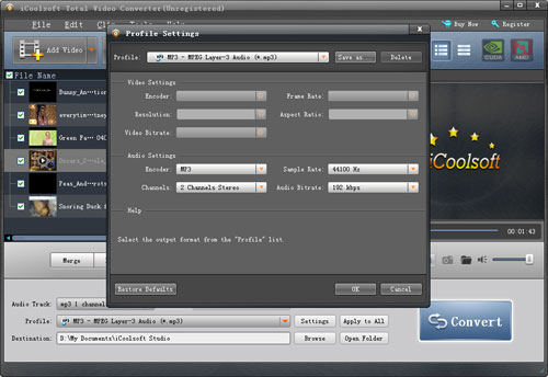 Tip: If you want to set the output parameters, such as, Sample Rate, Channels, and Audio Bitrate, you can click button "Settings".
