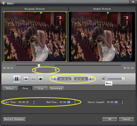 Step 3: Select a video from the file list and click "Trim" button. Then a "Edit" window will pop out as below. Click play button to play back the video. In the playback process, select the part which contains exact the dialogue/music.