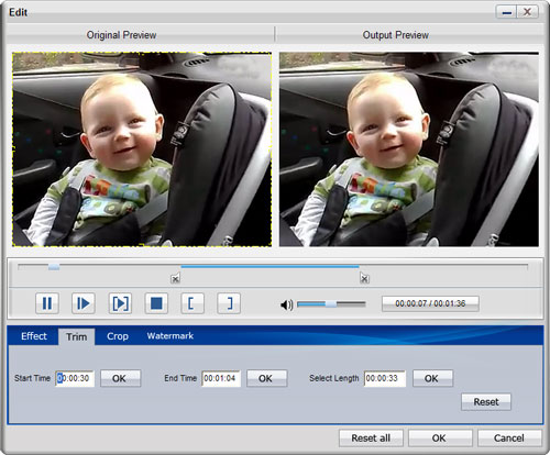 Step 3: Click button "Effect", "Trim", or "Crop" to edit the original AVI videos. Besides adjusting video effect, trimming video clips, cropping displaying area, you can also add text or picture watermark to edit the original AVI video. Click "OK" to save the editing and return to the main interface.