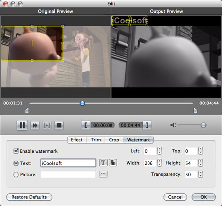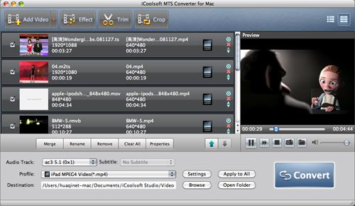With professional transformation encoding-iCoolsoft MTS converter for Mac helps you convert MTS video on Mac. The preview function will let you creat snapshot while reviewing. The effect function helps you to trim, crop, add watermarks to video. The powerful preset profiles are prepared for output formats selection and the flexible video settings are prepared to do adjustment immediately.