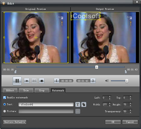 You can click button "Effect" to adjust Brightness, Contrast and Saturation. You can also check "Deinterlacing" checkbox to avoid mosaic and improve the quality of the video.