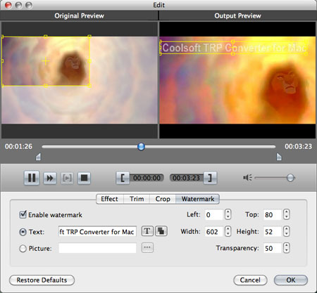 TRP, similar to TS or TP, is a kind of stream video container format. Commonly used by the recording of Free To Air (FTA) Satellite Receiver. People often have the need to convert TRP to a more compatible format for more usage, here we recommend this iCoolsoft TRP Converter for Mac to help you. This Mac TRP converting software is a powerful tool which can convert TRP to AVI format on Mac OS. Besides that, you can also use it to convert TRP into MPEG formats as well. Simple editing functions are also available, for you to edit your TRP files before converting.