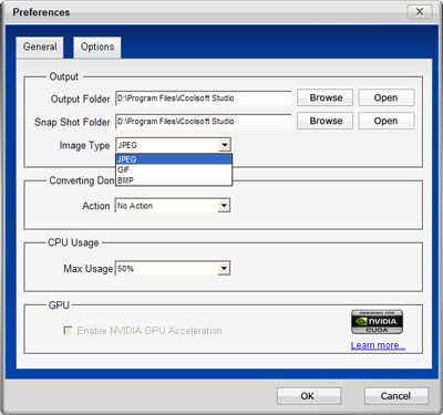 then you can set the format and output folder for the snapshots. Also in that window, you can set the output folder, select converting done action, and specify max usage of CPU. What's more, you can check "Enable NVIDIA GPU Acceleration" if your computer supports that. It will accelerate the converting speed to 6 times faster.