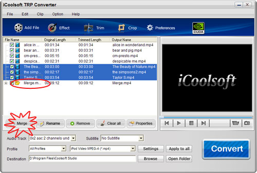Step 1: Click "Add File" button to add TRP videos. You can also use the "File" menu or drag TRP videos into the interface of the software directly. The added videos will be listed in the file list. If you want to merge several single files as one new file, you can select them from the file list and then click "Merge" button. The merged file will be listed in the file list.