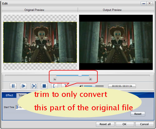 Step 3: Use "Effect/Trim/Crop" buttons on the tool bar to edit the video as you like. You can also add text or picture watermark by clicking the "Watermark" button in the edit window.