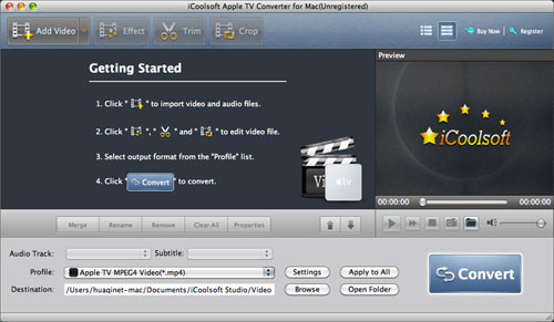 iCoolsoft Apple TV Converter for Mac enables you to convert most HD videos and general videos to Apple TV MPEG-4 and H.264 videos, and convert audio files to MP3, AAC, M4A format for playback on Apple TV.