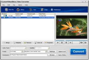 Do you often watch video files with your BlackBerry? Well, if you do, here is a brief guide telling you the easiest way to convert video files to the formats compatible with BlackBerry. The tool needed is iCoolsoft BlackBerry Video Converter. It is a professional software fully supports converting any video to BlackBerry video formats. The practical editing functions of it also can help you to customize video files as you like. Follow the guide and experience the convenience it brings you right now!