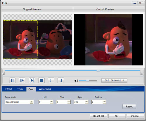 then you can adjust the Brightness, Contrast and Saturation; trim any time length of clips; or crop the display area as you like easily.