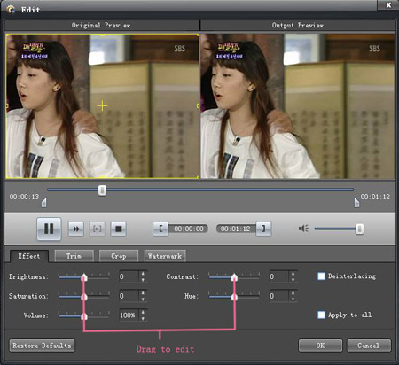 Drag the corresponding slider bar to adjust the Brightness, Contrast and Saturation. You can also check the "Deinterlacing" check box to improve video display quality of the interlaced video.