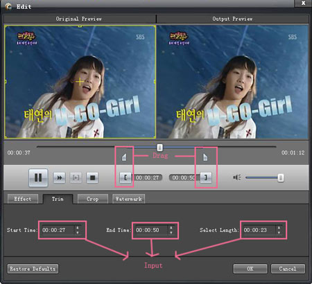 If you do not like some part of the original file, then you can use the trim function to get rid of that part. There are three ways for you to select the clip. You can drag the scissors icon, or click the start time and end time button, or input exact values in the boxes.