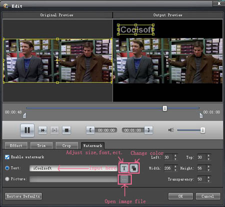 The software allows you to add both text and picture watermark according to your need. You can adjust the size, font, color, etc. for the text watermark. You can also easily adjust the location and transparency of the watermark.