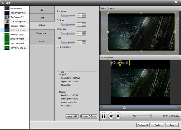 Click button "Effect", "Clip", or "Crop" then you can adjust the Brightness, Contrast and Saturation; trim any time length of clips; or crop the display area as you like easily.