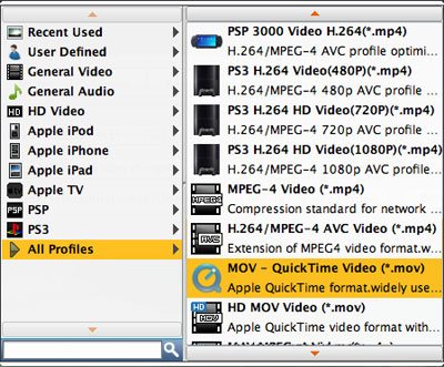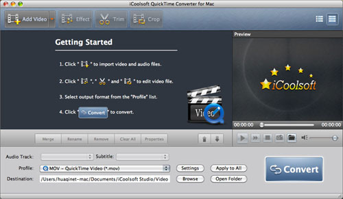 iCoolsoft QuickTime Converter Mac is the best choice for Mac users to convert any kind of videos into the Apple QuickTime formats like MOV, MP4, M4V, etc. What is the most important is that you can also use this Quicktime Converter Mac to convert quicktime (mov format) to any other formats including video like AVI, MP4, WMV, MPEG, FLV, 3GP, DivX and audio like MP3, WMA, AAC, WAV. Built-in with rich optimized profiles which allows your to make videos directly to fit your iPad, iPod, iPhone, Apple TV, PSP, PS3, etc.